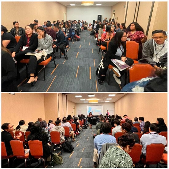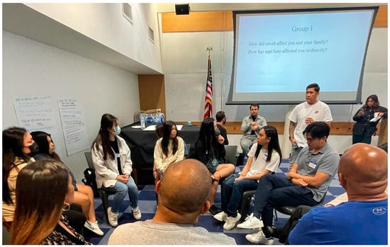 One of the authors organized, alongside other educators, licensed clinical behavioral health practitioners, librarians, several nonprofits, and motorcycle clubs, an open community-based forum (Figure 13 and Figure 14) for understanding mental health and encouraging help-seeking behavior to build upon familial and cultural capital and challenge dominant narratives of speaking about personal struggle as weakness. Licensed clinicians served as a resource should crises arise, while service providers and liaisons provided referrals for long-term needs, as college professors facilitated discussions. Community members donated “merienda”, snacks from various Southeast Asian restaurants and bakeries, to foster a communal, casual gathering where people would feel safe sharing their stories and narratives to reframe and redefine some of the harmful practices they may have experienced growing up. Figure 13 shows one of the group breakouts where attendees shared stories based on their identities as Asian-Americans. Much of what was shared included experiences with discrimination during the height of COVID, and those impacts on their well-being. It was important to lead these groups into conversations about how communal care and social support can help counter the negative effects of discrimination. Figure 14 shows all attendees at another mental health forum. Different communities of varying ethnic groups, socioeconomic status, and experiences came together to forge supportive safe spaces together.
