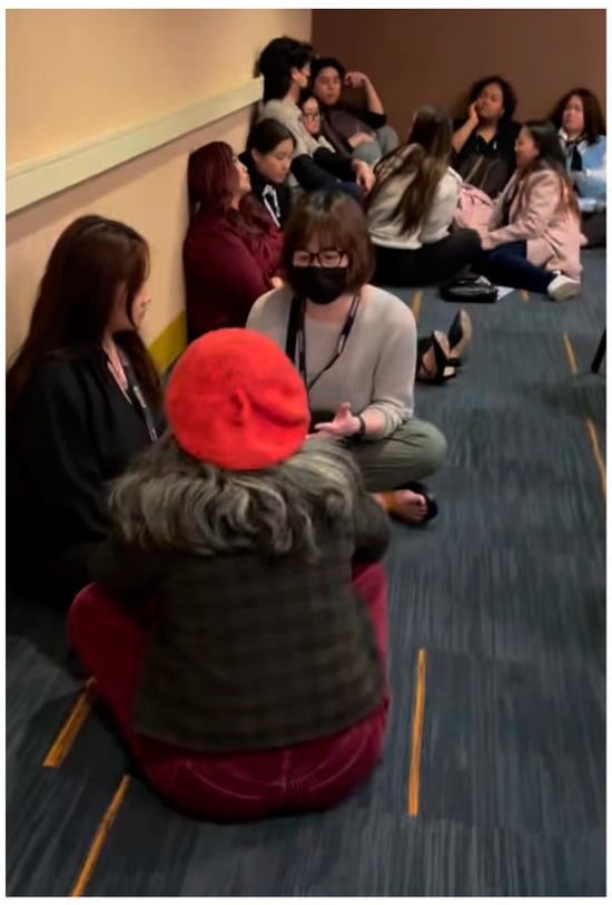 Attendees sharing in pairs and trios at a 2024 Asian Pacific Americans in Higher Education (APAHE) workshop facilitated by the authors. The room was packed, with many students sitting on the floor when physical seats were not available. The photograph is from the authors’ personal collection.
