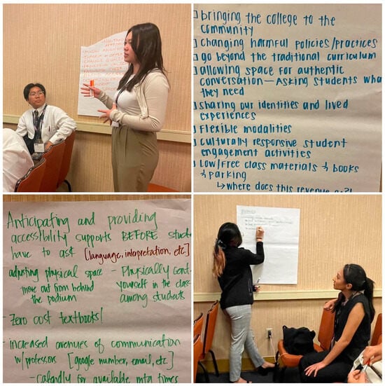 As seen in Figure 16, attendees were asked to engage with one another by sharing their experiences within educational systems and their communities. The groups included a diverse mix of students, faculty, student services staff, and administrators. Attendees were asked guiding questions about their experiences and responded in pairs or trios by sharing personal stories. By storytelling first in smaller pairs, all attendees had the opportunity to share and hear each other, as shown in Figure 17. These stories were then shared in a larger group to identify themes and narratives. As previously mentioned, storytelling builds and preserves community among marginalized groups. Attendees were then challenged to envision counternarratives to identify how negative experiences can be met with the strength-based narratives of their communities. Storytelling and counter-narratives challenge “received wisdom” and open “new windows into reality, showing us that there are possibilities for life other than the ones we live” (Delgado 1989, p. 2414). Attendees then envisioned ways they could feel more supported within their spheres of influence, as shown in Figure 18. These shared stories and narratives, engaging with one another, and dreaming together helped forge a collective identity, which is instrumental to enhancing overall well-being (Oster et al. 2014). McGee (2016) recommends that students of varying identities who find that they share common narratives, e.g., experiencing racial microaggressions on campus, should work together to strategize for collective agency.