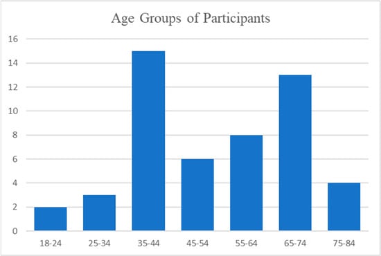In terms of country of citizenship, participants were from Australia (n = 1), Poland (n = 1), Canada (n = 1), Croatia (n = 1), the Philippines (n = 1), New Zealand (n = 1), and the United States (n = 43). Two participants did not respond to the citizenship question. Countries of residency were reported as the same as countries of citizenship. Although there were only 51 participants in this study, the survey was posted several times in major groups on social media pertaining to Carpatho-Rusyn culture. Snowball sampling was also used. The research team had hoped to obtain a larger sample; however, we understood that many descendants of Carpatho-Rusyns may not even be aware of their ethnic identities. Moreover, finding participants outside of social media groups would be difficult to identify. Figure 1 displays the age groups of participants.