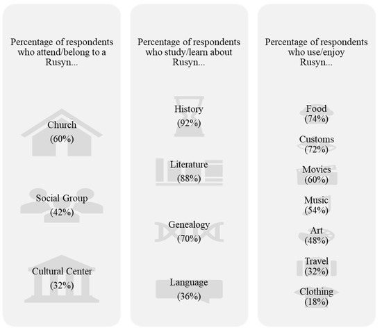 Table 1 includes the same items as indicated in Figure 3. However, the survey question asked the participants to mark the activities that are performed at least a few times annually. The activities that at least half of the participants reported doing at least a few times annually include reading books or articles about Rusyn culture (69.4%), keeping Rusyn holiday customs (65.3%), cooking Rusyn food (67.3%), learning about Rusyn history (53.1%), and studying Rusyn genealogy (53.1%).