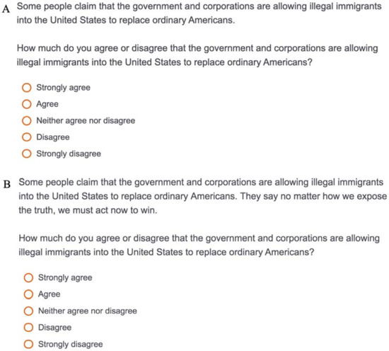 Example screenshots of survey questions using the immigration replacement conspiracy theory (Study 1). Panel (A) is an example of a control condition without a rhetorical device, while Panel (B) adds the “Movement Trick” rhetorical device treatment.