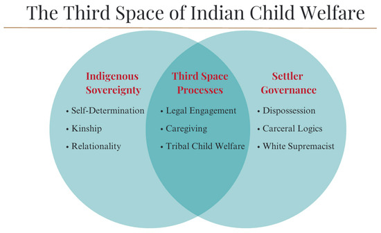 At the intersection of Indigenous Sovereign Space and Settler Governance Space lies the Third Space of Indian Child Welfare: a site of active engagement and creative resistance where Indigenous nations engage settler systems to reclaim governance over family and community life. Rather than a compromise between the two, the Third Space is a generative field where tribal nations assert jurisdiction, redesign care infrastructures, and redefine the meaning of safety and belonging through sovereign practice. In this space, legal pluralism becomes lived experience, and the work of care is inseparable from the work of governance. Third Space interventions disrupt rather than reconcile settler norms and refuse imposed definitions of risk and fitness.