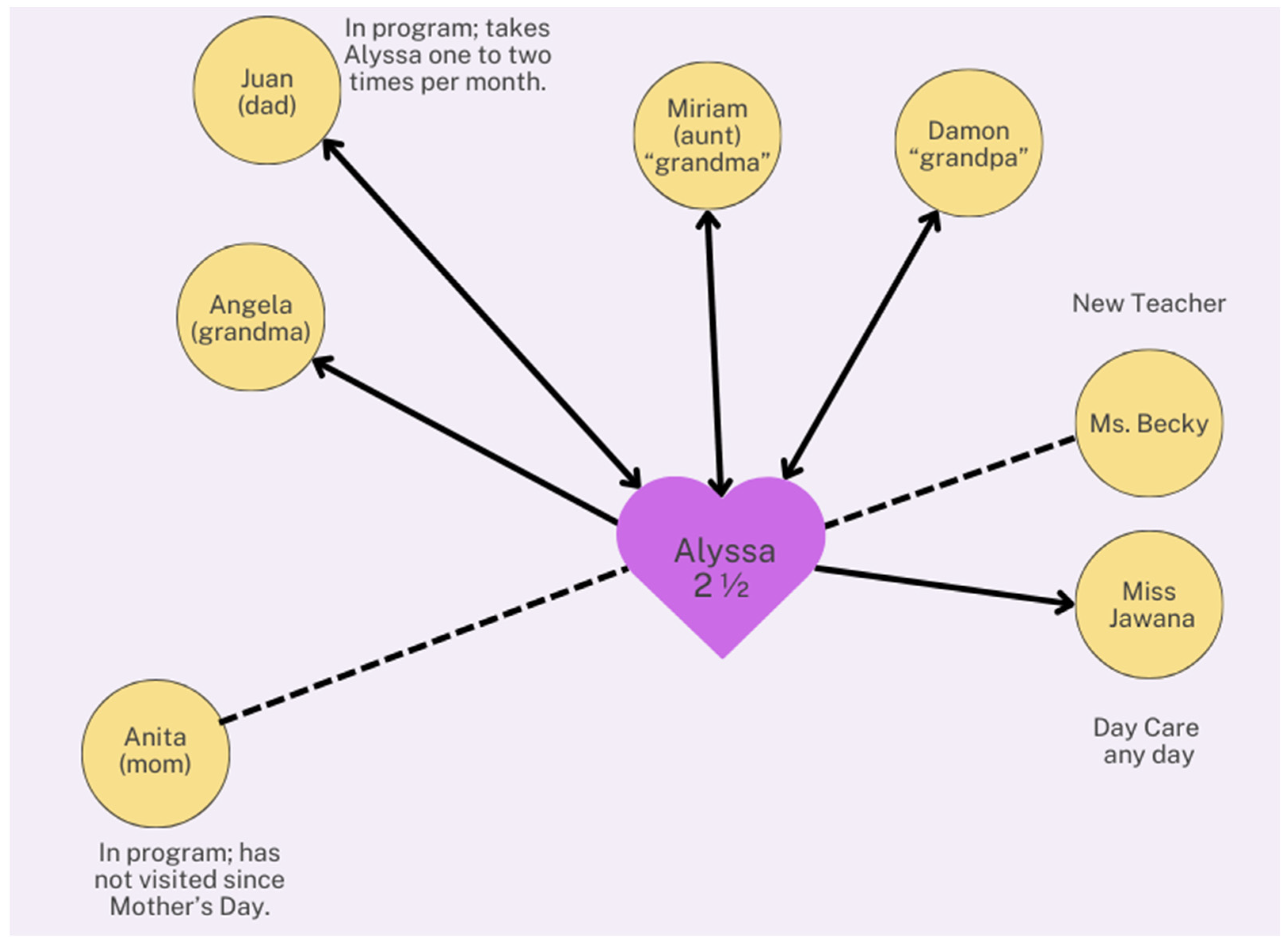 “Nearly all young children develop close bonds or “heart connections” with important others. Please put your child’s name and age in the heart below. Next, draw circles that represent each of the important people in your child’s life, putting each person’s circle close to or farther away from your child’s heart to indicate how frequently your child sees, visits, or calls that person. Then connect each circle to the heart with a solid line for especially emotionally strong bonds, and a dotted line for others who are loved, but just not quite as emotionally close”.