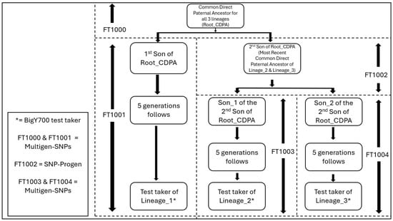 Figure 1 shows how three BigY700 test takers are related, thus demonstrating how SNP-Progens and Multigen-SNPs are identified. Test taker of Lineage_1* descends from the 1st son of the common direct paternal ancestor for all 3 lineages (Root_CDPA). Test taker of Lineage_2* and Test taker of Lineage_3* both descend from the 2nd son of Root_CDPA. The situation provides Y-SNP data that can allow us to identify Multigen_SNPs that cannot be assigned to a specific progenitor in the pedigree (FT1000, FT10011, FT1003, and FT1004), and one SNP-Progen (FT1002) in the example provided. Based on the information shown in Figure 1, everyone in the phylogenetic pathway will have their Y-SNP ancestral path written, as shown in Table 2.