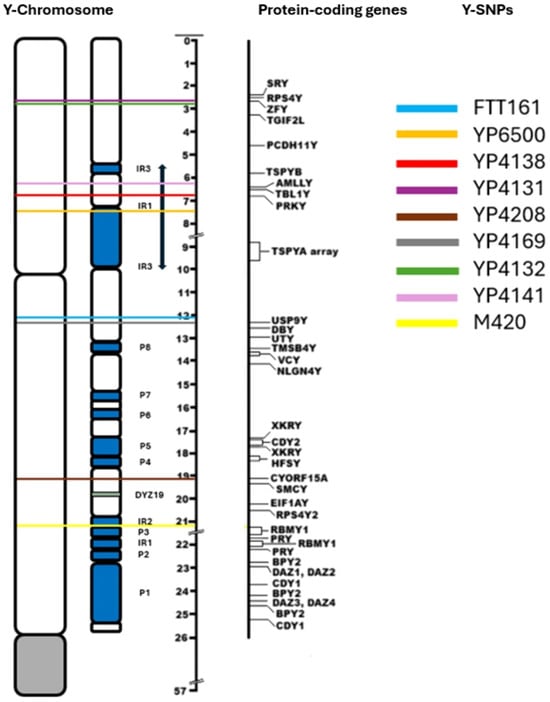 Bonito et al. (2021) suggested that the palindromic regions of the Y-chromosome are highly prone to gene conversion events; therefore, the identification of SNPs may be complex when performing short-read targeted NGS. Hallast et al. (2023) identifies the four heterochromatic subregions in the human Y-chromosome—the (peri-)centromeric region, DYZ18, DYZ19, and Yq12—as being highly repetitive; therefore, these regions are less suitable for the identification of reliable Y-SNPs using NGS. Figure 3 is a map of the Y-chromosome that identifies the positions of the Y-SNPs shown in Table 3. These Y-SNPs are located within the non-recombining portion of the Y-chromosome (NRY), where Y-SNPs occur at a relatively slow rate and without the instability caused by gene conversion, deletions, and duplications. Furthermore, these Y-SNPs are not located in any of the regions that are deemed unreliable for Y-SNP calling; therefore, these Y-SNPs are regarded to be highly stable over generations, making them reliable for phylogenetic studies.