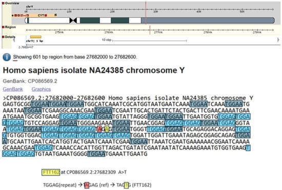 The Y-SNP FTT162 is phylogenetically positioned downstream of FTT161, and it defines a noble Hay branch that has a significant number of descendants: n = 47 test takers at the YFull database (YFull 2025). This Y-SNP is in the highly repetitive heterochromatic region of the Y-chromosome (see Figure 4). This region is regarded as having large portions of noncoding DNA that are typically prone to mutations caused by replication slippage (Lemos et al. 2010; Lovett et al. 1993; Viguera et al. 2001); therefore, Y-SNPs occurring within this region of the Y-chromosome need to be treated with caution, as they may not be phylogenetically relevant (Hallast et al. 2015).