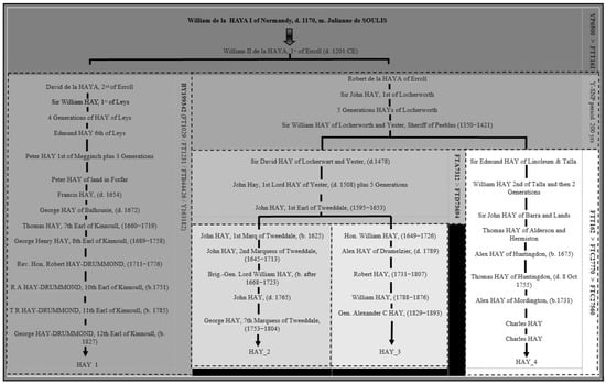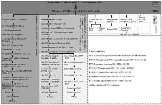 Although the alternative Hay phylogenetic tree proposed in Figure 7 is possible on a genetic level, it is important to highlight that there are alternative ancestral pedigrees for HAY_4, but these cannot be documented back to William II de la HAYA, 1st of Erroll (d. 1201) due to a lack of records. To validate HAY_4’s true line of descent back to William II de la HAYA, 1st of Erroll, the Y-DNA testing of a well-documented direct paternal descendant of the four remaining sons of William II de la HAYA, 1st of Erroll (William, Malcolm, Thomas and John HAY I of Naughton) would be required.