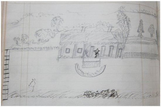 The Rothery drawings illustrate family history. There are 11 separate drawings in pencil in the empty pages of the Register of Accounts for 1836 and 1839, and one drawing (Figure 1) from the back of the 1836 volume shows a barn with a tree of heaven in the foreground. These drawings were made in the early 1860s when the register was no longer in use. In the yard of the barn is an illustration of four Aboriginal people. The tree of heaven was specially planted at Cliefden in the 1830s, and the species originates in China. Planting exotic trees was a merchant custom, and the Lockyer family had London merchant connections (Seppings Family History 2010). The rendering of the tree shows its importance to the family, but it is also a place and time locator. The barn was opposite the tree. The tree of heaven is a deciduous species, and the drawing is set in spring or summer. The event at the Aboriginal camp in the yard next to the barn occurred at a particular time because it was before a side fence, crossed out, was built. The tree, the hard lines of the barn outline, and the fences crossed indicate effort and a wish for accuracy. The representation of the fences indicates they were important spatial locators for the artist. Fences drawn hard and corrected appear in several of the drawings. In Figure 2 the house is drawn with large, curved fences on either side of it, as if they were protective arms. Fences have significance. Another hand had drawn the Aboriginal people. The lightness and skill suggest it was Caroline, as her handwriting was lighter and more graceful than William’s. The four Aboriginal people depicted are involved in a conflict, and two are lying on the ground, either dead or wounded, while the others brandish weapons. The fire in the middle of the skirmish shows it was a camp.