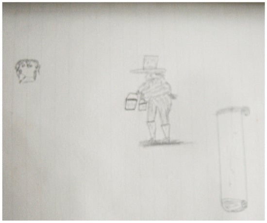 The other drawings are of two kinds—there are drawings that relate to the 1864 raid on Cliefden by the bushranger Ben Hall, another record of violence, and, secondly, risqué drawings. The bushranging incident is referenced in the old 1839 register. There is an elaborate drawing of the house with the trees and field in the background (Figure 3). A side fence is drawn in both pencil and ink. A newspaper report by the Western Herald in 16 November 1962 reports William Rothery claiming that Cliefden was ‘impregnably fortified’, meaning it was well protected from a bushranging attack. Perhaps such sentiments resulted in the children’s rendition of the fences. Curved at the entrance to the house are two gardens, one crescent shaped and the other square. Hidden in the long grass at the front of the property is a cart with two horses. These are drawn with ink. At the door of the house is a bearded man with a wide brimmed hat and a sharp black beard; he is also rendered in ink. They are both important to the story. The man with the beard looks out at us with a very clearly marked eye. The darker drawing of him in the landscape emphasises his menace. This figure with the same beard appears in the 1836 volume (Figure 4). He carries two buckets and has high Wellington boots. He stands beside an uncertain object that looks like a rolled-upswag. Stories of the Ben Hall bushranging gang compress their visits to several stations. Unlike the oral tales, the gang did not enter the Rothery household; they were repelled at the locked door, behind which Mr Rothery assured them he was well prepared for them. One of the gang left with the overseer’s Wellington boots.