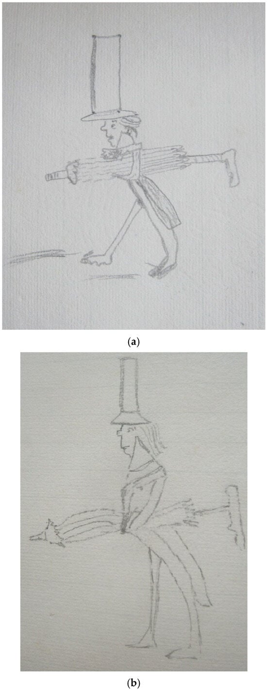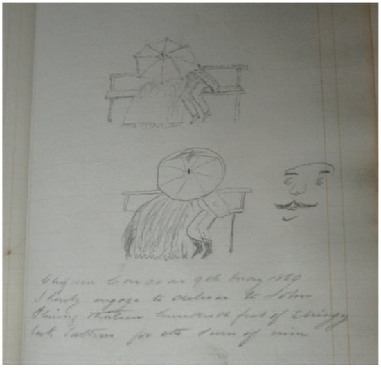 The second kind of pictures are risqué drawings of encounters between a white woman and man. There are two drawings of two separate men, both carrying an umbrella (Figure 5a,b). Their top hats are exaggeratedly tall. They wear different suits, and their shoe soles are different; the sense of accuracy is there again. The drawings may have come from different hands, but one is not a copy of the other because one is landscaped and the other portrait. The faces are similar enough to be a depiction of one man on separate days, but the chin on one of the figures is weaker, despite the nose being similarly rendered. The first carries a large beach-like umbrella high under his arm. The second carries it far lower on his body so it is in the same position as his penis; it stands out from the body, and the end of the umbrella is intricately drawn. Figure 6 is rendered in the same way—two drawings on a page indicating a seated man and woman kissing behind an umbrella. Only the skirt of the woman and the trousers of the man can be seen on the bench; the umbrella hides their identity. This is a secret, illicit relationship. Again, the men are differently dressed by the separate artists, with the first figure wearing a very ill-drawn baggy suit, the second figure wearing trousers and shoes, and the third wearing high black Wellington boots and close-fitting tight pants with buttons on the side, indicating a gentleman squatter. These are in two distinct hands or two styles of drawing. There are two attempts at beginning the umbrella rendition on the first page. The pencil strokes are more ragged in two of the drawings and finer in the third. The skirt of the woman has the same trim in all three pictures—this is a reference to one woman. On the side of the second page is a drawing of a man’s face with an elaborate curled moustache and beard. He looks surprised. Underneath is a handwritten copy of a work agreement from 9 May 1869, which may date the drawings, particularly as it is under the seated couple. It is a clearing agreement with John Fleming for ‘1300 feet of stringy bark for the sum of nine…’ and the copying is abandoned. The inclusion of the copying brings the authority of the father onto the page. But this is juxtaposed with the risqué image of the couple.