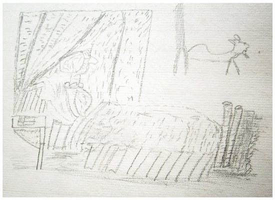 The ragged strokes again appear in Figure 7, where a woman is shown in great detail in bed, with patterned bed hangings and an elaborate coverlet. She has a bedside table with books, and the end of the bed is drawn as if there are a series of books leaning there. This is not an attractive woman; her nose is big, her face marked with either wrinkles or cream, and her hair in a cap. She is sitting up stiffly in bed and she has large breasts covered tightly by a nightgown with frills at the neck. Walking away from the woman is a cat with what seems to be something in its mouth. Its hindquarters are a sharp inverted ‘v’ as if attention is meant to be drawn to them. This picture is meant to be comic in some way that escapes a 21st century viewer. Traces of sexuality in the breasts of the woman and the hindquarters of the cat suggest the humour is sexual in origin.