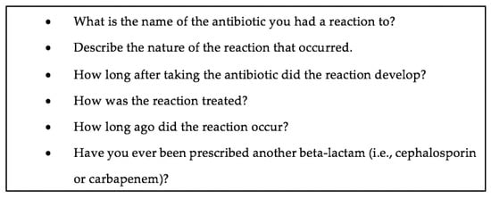 The initial management of patients with a history of beta-lactam allergy requires a detailed allergy assessment, given that many patients are inappropriately labeled as beta-lactam allergic. Oftentimes, known adverse effects of a beta-lactam are mislabeled and documented as a beta-lactam allergy. Approximately 90% of patients labeled as allergic can be de-labeled through a detailed allergy assessment or allergy testing [,]. The appropriate assessment of beta-lactam allergy includes the evaluation of factors such as the specific agent causing the reaction, the type, severity, and timing of the reaction, and previous tolerability of other beta-lactam agents. The de-labeling of penicillin allergy, based on historical evaluation alone, has been demonstrated to be safe and effective in patients reporting a mild, non-immune-mediated adverse drug reaction, or where subsequent tolerance to the implicated penicillin has been identified through their medical or pharmacy records []. Figure 1 includes a list of questions that may be appropriate to ask patients who report a beta-lactam allergy.