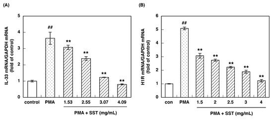 Stimulation with PMA significantly increased IL-33 mRNA levels in Swiss 3T3 cells (Figure 1A). The hot water extract of SST significantly and dose-dependently suppressed PMA-induced up-regulation of IL-33 mRNA in Swiss 3T3 cells (Figure 1A). H1R gene up-regulation in response to PMA was observed in HeLa cells (Figure 1B). The hot water extract of SST significantly and dose-dependently suppressed PMA-induced up-regulation of H1R mRNA in HeLa cells (Figure 1B).