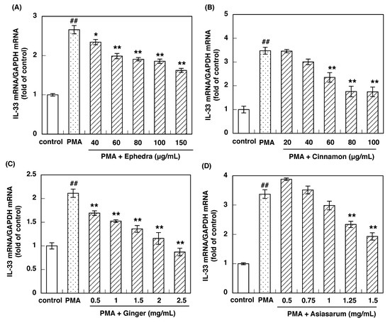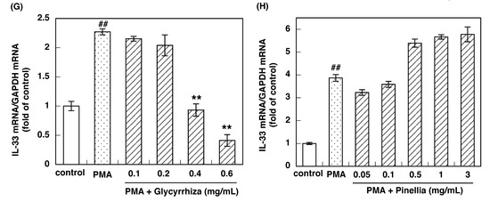 Effects of eight crude drugs of SST on PMA-induced up-regulation of IL-33 mRNA. Swiss 3T3 cells were treated with Ephedra herb (A), cinnamon bark (B), processed ginger (C), Asiasarum root (D), peony root (E), Schisandra fruit (F), Glycyrrhiza (G), and Pinellia tuber (H) for 12 h before stimulation with 100 nM PMA. After stimulation with PMA for 3 h, the cells were harvested, and total RNA was prepared. IL-33 mRNA levels were determined using quantitative RT-PCR. Data are expressed as means ± SEM (n = 3–4). ## p < 0.01 vs. control; * p < 0.05, ** p < 0.01 vs. PMA.