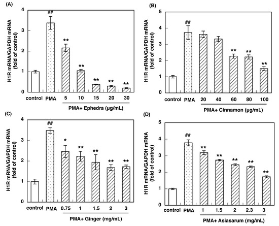 SST is composed of eight crude drugs: Ephedra herb, cinnamon bark, processed ginger, Asiasarum root, peony root, Schisandra fruit, Glycyrrhiza, and Pinellia tuber. Thus, we next investigated whether each constituent crude drug of SST suppresses PMA-induced IL-33 and H1R mRNA up-regulation in Swiss 3T3 cells and HeLa cells, respectively. The hot water extracts from Ephedra herb, cinnamon bark, processed ginger, Asiasarum root, peony root, Schisandra fruit, and Glycyrrhiza significantly and dose-dependently suppressed PMA-induced IL-33 mRNA up-regulation in Swiss 3T3 cells (Figure 2A–G). These extracts also significantly and dose-dependently suppressed PMA-induced H1R gene up-regulation in HeLa cells (Figure 3A–G). However, Pinellia tuber did not suppress PMA-induced up-regulation of IL-33 or H1R mRNAs (Figure 2H and Figure 3H).