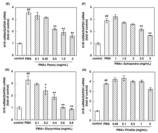 Effects of eight crude drugs of SST on PMA-induced up-regulation of H1R mRNA. HeLa cells were serum-starved for 24 h and treated with Ephedra herb (A), cinnamon bark (B), processed ginger (C), Asiasarum root (D), peony root (E), Schisandra fruit (F), Glycyrrhiza (G), and Pinellia tuber (H) for 12 h before stimulation with 100 nM PMA. After stimulation with PMA for 3 h, the cells were harvested, and total RNA was prepared. H1R mRNA levels were determined using quantitative RT-PCR. Data are expressed as means ± SEM (n = 3–4). ## p < 0.01 vs. control; * p < 0.05, ** p < 0.01 vs. PMA.