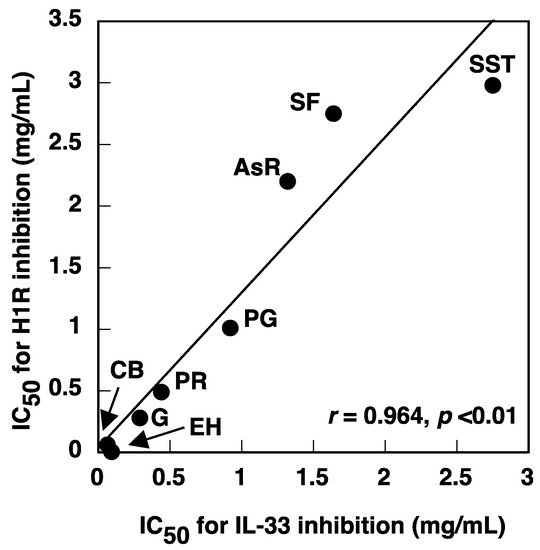 The correlation between IC50 values of SST and its seven crude drugs to inhibit the IL-33 and H1R gene expression. A Spearman’s rank correlation test was used for the statistical analysis (r = 0.964, p < 0.01). SST: Syo-seiryu-to; EH: Ephedra herb; CB: cinnamon bark; PG: processed ginger; AsR: Asiasarum root; PR: peony root; SF: Schisandra fruit; G: Glycyrrhiza.