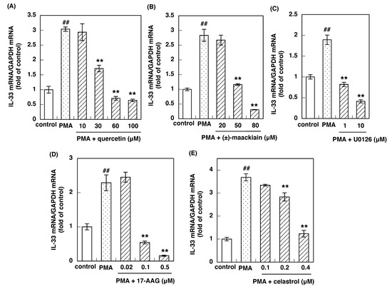 Effects of inhibitors of the H1R gene expression signaling pathway on PMA-induced IL-33 gene up-regulation. Swiss 3T3 cells were treated with quercetin (A), (±)-maackiain (B), U0126 (C), 17-AAG (D), and celastrol (E) for 12 h before stimulation with 100 nM PMA. After stimulation with PMA for 3 h, the cells were harvested, and total RNA was extracted. IL-33 mRNA levels were determined using quantitative RT-PCR. Data are expressed as means ± SEM (n = 3–4). ## p < 0.01 vs. control; ** p < 0.01 vs. PMA.
