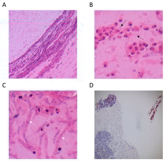 Images from H&E staining of samples obtained by the aspiration of nasal secretions technique. (A) A layered aspect of eosinophils aggregated in mucin, and abundant granules (50× magnification); (B) CLC (black arrows) surrounded by granules and necrotic eosinophil cells (400× magnification); (C) Presence of fungal hyphae (400× magnification); (D) Combination of patches of eosinophil and neutrophil cells (10× magnification).