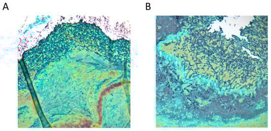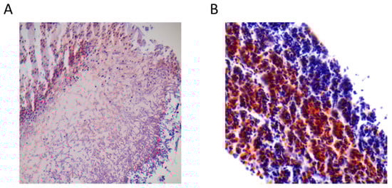 Images from Gomori methenamine silver staining (GMS) of samples obtained by the aspiration of nasal secretions technique. (A) Massive presence of fungal hyphae (50× magnification); (B) Massive presence of fungal hyphae (100× magnification).
