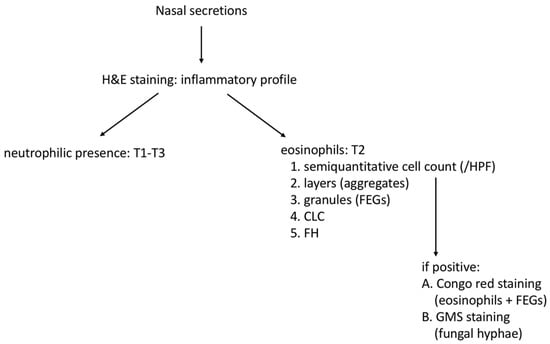Another observation was the combined presence of T1 and T2 cellular aggregates in a patchy appearance where conglomerates of neutrophilic cells can be seen together with T2 aggregates (Figure 1D). This corresponds with the findings of Delemarre et al., who observed neutrophil inflammation as a regular part of severe T2 CRS []. Congo red staining will not occur when neutrophilic inflammation is present except in these combination cases. Adjuvant Congo red staining therefore may be considered a useful diagnostic tool to distinguish T2 eosinophilic inflammation, including FEGs, with a T1 driven mechanism. The proposal for structured histopathology of nasal secretions for endotyping CRS as performed in the current study is provided in Figure 4.