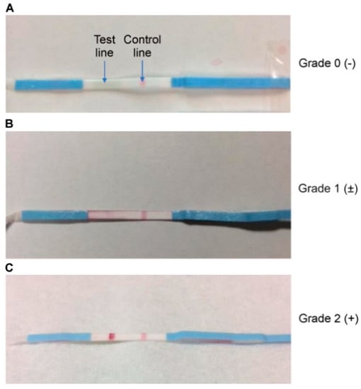 The AW test kit strips were inserted into the nasal cavity to absorb nasal discharge, and the strip was removed after confirming that it was moistened. The strip was then immersed in a 2.0 mL Eppendorf tube with a few drops of development solution buffer for 10 min at room temperature. The strip contains reagents necessary for the measurement of total IgE level, and a red line develops at the specified position of the strip when an IgE antibody is present. According to the manufacturer’s instructions, the test results are categorized into three grades: Grade 0, no detectable IgE (no line); Grade 1, a low total IgE level (test line weaker than the control); and Grade 2, a high total IgE level (test line similar to or stronger than the control) [,,]. In this study, Grades 1 and 2 were taken to indicate a positive result for the presence of total IgE level in nasal fluid (Figure 1).