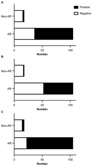 Comparison of the detection rates of total IgE in nasal fluid using the AW test and the conventional nasal smear examination for eosinophils between the AR and non-AR patients: (A): Total IgE in nasal fluid. (B): Eosinophils in nasal smear. (C): Combination of the two examinations.