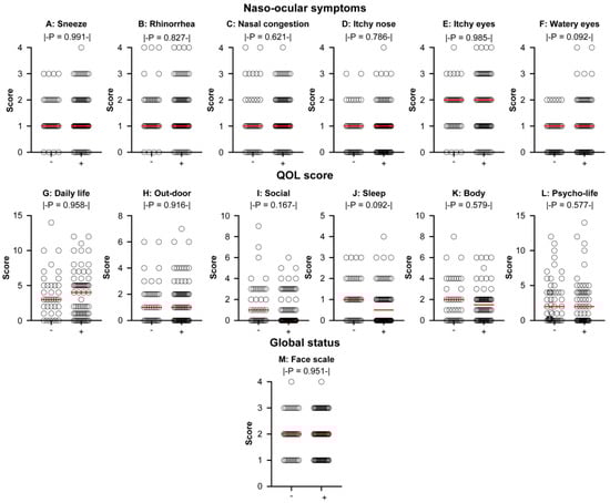 The naso-ocular symptoms, QOL, and global status were assessed using the JRQLQ No. 1 Naso-ocular symptoms score: no significant differences in sneeze (p = 0.991; Figure 3A), rhinorrhea (p = 0.827; Figure 3B), nasal congestion (p = 0.621; Figure 3C), itchy nose (p = 0.786; Figure 3D), and itchy eyes (p = 0.985; Figure 3E) were seen between the patients who were positive and those who were negative for total IgE in nasal fluid. Severe watery eyes tended to be more common in patients who were positive for total IgE in nasal fluid (p = 0.092; Figure 3F). QOL scores: no significant differences in daily life (p = 0.958; Figure 3G), outdoor (p = 0.916; Figure 3H), social (p = 0.167; Figure 3I), sleep (p = 0.092; Figure 3J), body (p = 0.579; Figure 3K), and psycho-life (p = 0.577; Figure 3L). The global status as determined by a face scale was similar between the two groups (p = 0.951; Figure 3M).