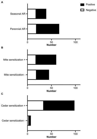 Among the 105 AR patients, 66 patients were classified as having perennial AR with or without seasonal exacerbation, and 39 patients were classified as having seasonal AR. A total of 47 of the 66 (71.2%) patients with perennial AR, and 21 of the 39 (53.8%) patients with seasonal AR were positive for total IgE in nasal fluid, which indicated that the detection rate tended to be higher in patients with perennial AR (p = 0.092 by the chi-square test; Figure 4A). House dust mites (sensitization in 60 out of 105 patients; 57.1%) and Japanese cedar pollen (sensitization in 98 out of 105 patients; 93.3%) were the major sensitizing antigens. The detection rate of total IgE in nasal fluid was not significantly different in those with or without sensitization to house dust mites (p = 0.220 by the chi-square test; Figure 4B) or to Japanese cedar pollen (p = 0.695 by the chi-square test; Figure 4C).