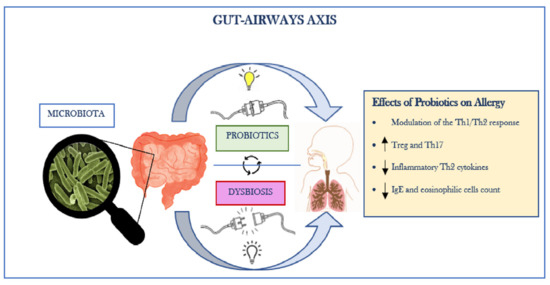 All these data demonstrate the importance and effectiveness of administering probiotics (as single strain or mixture) to modulate the gut and respiratory microbiota, thus improving prognosis and reducing symptoms in patients with allergic diseases and respiratory viral infections, such as COVID-19 (Figure 1).