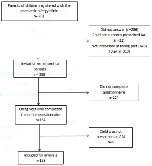 A total of 701 parents were contacted between June 2021 and May 2022. Of them, 313 could not be reached by telephone or did not meet eligibility criteria when screened. An invitation email was sent to 388 parents to take part in the study. A total of 164 responses were received to the Google Forms questionnaire. This equates to a response rate of 42.2%. Six responses were excluded from analysis on further inspection, as they responded ‘No’ when asked if their child had been prescribed an AAI. Thus, 158 participants were included in the study. A flow diagram depicting the recruitment of participants to the study is shown in Figure 1. A summary of participant demographics is shown in Table 1.