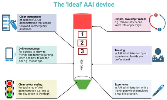 It was found that most caregivers preferred the Epipen® device (63%). This most likely correlates with Epipen® being the most carried device and the familiarity of Epipen® in the community. When parents who had switched brands in the past were asked why they preferred a particular brand, the main themes that emerged were layout, design, training, and online resources. Based on these findings, a figure representing the ‘ideal’ AAI device was created visually explaining these findings. These factors should also be considered when assessing AAI carriage among parents and young patients, as one recent review found that poor AAI design reduced the likelihood of AAI carriage among adolescents and young adults with food allergies []. Of note was the high number of parents, which recited the rhyme ‘blue to the sky, orange to the thigh’, highlighting the value of clear and simple colour coding that is easily recalled in an emergency. Although it can be said that Epipen® may be the most preferred AAI due to the high number of parents who carry it, it can be implied from parent responses that this may also be due to having only ever received training in the Epipen® device, or that they have received training in this device most frequently, or even because they have had to use in a real-life scenario. These findings support EACCI recommendation of further study into the benefits of caregiver administration of an adrenaline auto injector during anaphylaxis during a hospital-based oral food challenge []. This is supported by a randomised control trial, which found that anaphylaxis at food challenge, followed by self-administration of injected adrenaline, was associated with an increase in health-related quality of life (HRQL) and self-efficacy in young people with peanut allergy [].