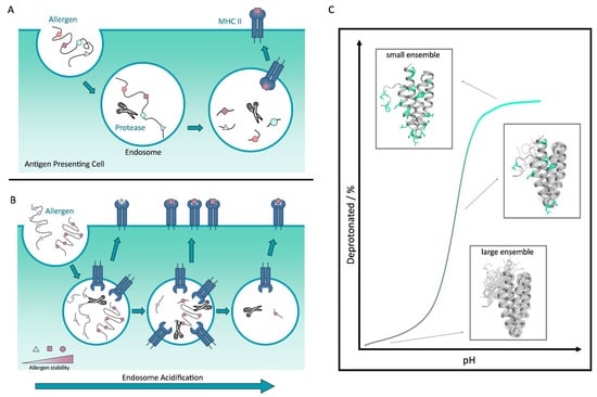 (A) The uptake of the allergen into the endosome of an antigen-presenting cell: the allergen enters the cell via endocytosis. In the endosome, proteases cut the allergen into small peptides, which are then loaded onto the MHC II and presented on the cell surface. (B) The acidification of the endosome in relation to different allergen stabilities. Depending on the stability of the allergen, the proteins are digested earlier or later in the phase of the maturation of the endosome. (C) Schematic representation of the structural behavior of an allergen as a function of varying pH. At low pH, a small fraction of the allergen is deprotonated and the allergen is structurally variable. The conformational ensemble is large. With increasing pH, the conformational ensemble becomes smaller, and a higher fraction of the allergen is deprotonated.