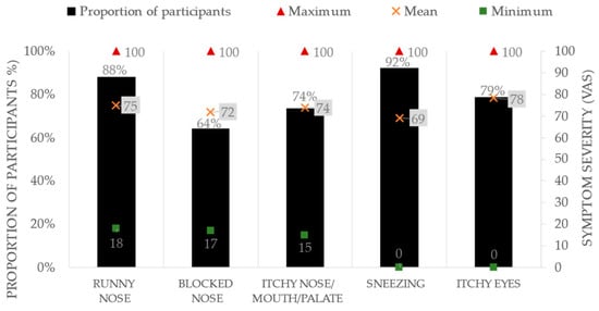 Participants mostly experienced sneezing (92%) at a severe level (mean VAS = 69), runny nose (88%) at a severe level (mean VAS = 75), and itchy eyes (79%) also at a severe level (mean VAS = 78) (Figure 1). The other symptoms (12%) experienced include coughing, difficulty breathing, fatigue, headache, itchy skin, itchy ears, watery eyes, sore throat, swollen eyes, and painful sinuses. More than half of the participants’ AR status were classified as moderate-severe persistent (61%), followed by moderate-severe intermittent (38%), mild intermittent (0.5%), and mild persistent (0.5%). Thirty-four percent of participants reported having coexisting asthma.