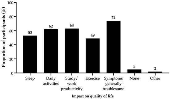 The majority of the participants (97%) reported that their symptoms affect at least one aspect of their quality of life in Figure 2, with symptoms most commonly reported as generally troublesome (74%) followed by the impact on their study/work productivity (63%) and daily activities (62%).
