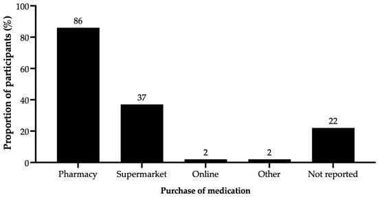 Of those who reported managing their AR with medication (91%, 167/185), 89% of the participants purchased their medication for themselves and predominantly from the pharmacy (86%) and supermarket (37%), as shown in Figure 3. More than a third of the participants purchase medication from more than one location (e.g., pharmacy and supermarket).