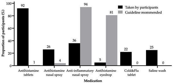 This study also identified that, as with the general AR population, most young adults use inappropriate medications to manage their AR. Only 11% of the study participants were using medications that are appropriate to treat the severity of their symptoms. This is in line with the results of a recent Australian study, which found 15% of adults with AR selected optimal medications []. These results are reflected by the high number of participants experiencing an AR burden on their day-to-to day living. In reviewing the medications used, the majority were using antihistamine tablets. Although this finding is consistent with many other studies investigating AR medication use in adults [,,] and oral medications are known to be patients’ preference, the high level of antihistamine tablets use in this cohort is not appropriate for their predominant moderate-severe AR status. Instead, anti-inflammatory nasal spray should be recommended as their first-line medication [], however this was only reported to be used in just over a third of participants. The management of AR with inappropriate medication shows that both pharmacists and GPs need to be aware of the current guidelines for AR and also patients’ perceptions in their self-management of AR. Currently, there are still unmet needs in GP practices, as some are not aware of the current AR guidelines to recommend the most appropriate medication and allergen immunotherapy [].
