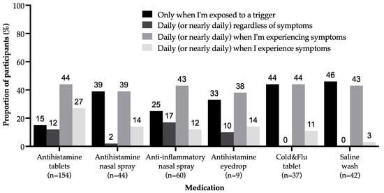 The frequency of medication use by participants is portrayed in Figure 5. All medications were most commonly taken daily when participants were experiencing symptoms, especially for antihistamine tablets (44%), antihistamine nasal spray (39%), anti-inflammatory nasal spray (43%), antihistamine eyedrop (38%), and cold and flu tablets (44%). However, saline washes are most commonly taken only when participants are exposed to a trigger (46%).