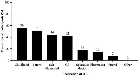 Participants report on how they realised they have AR in Figure 6. More than half of the participants (56%) have had AR since childhood, and 51% were told by their parents. Participants were most commonly self-diagnosed (44%) and officially diagnosed by general practitioners (GPs) (42%), followed by specialists (18%) and pharmacists (14%).