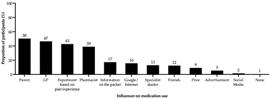 As seen in Figure 7, parents were the most commonly reported influencer (50%) in participants’ medication use, followed by GPs (47%) and experiments based on past experience (43%).