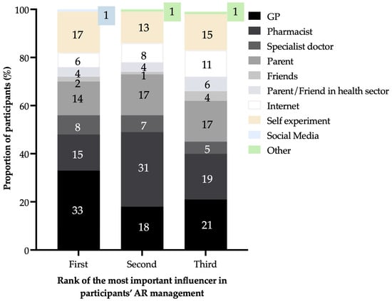 Participants ranked the three most important influencers in their AR management in Figure 9. Overall, GPs were the most important influencer followed by pharmacists. Comparing the three rankings, GPs were the most important influence in the first (33%) and third (21%) rankings, whereas pharmacists were most important in the second rank (31%).