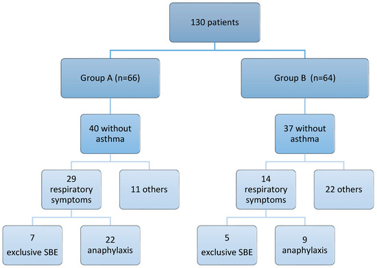 In our cohort of patients with limpet allergy, severe bronchospasm occurred following limpet ingestion regardless of a prior asthma diagnosis. In Group A, 40 out of 66 patients (60.6%) had no pre-existing asthma diagnosis, while in Group B, 37 out of 64 patients (57.8%) similarly lacked such a diagnosis. Despite this, respiratory symptoms were observed in both groups. In fact, in Group A, 29 out of 40 patients (72.5%) without previous asthma diagnoses experienced respiratory symptoms after ingesting limpets. This included 7 cases of isolated severe bronchospasm and 22 cases of anaphylaxis (which included bronchospasm). In Group B, 14 out of 37 patients (37.8%) without prior asthma diagnoses also presented with respiratory symptoms, consisting of five cases of isolated severe asthma and nine cases of anaphylaxis (Figure 1).