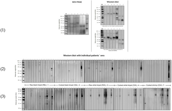 SDS-PAGE (1) and IgE Western blot (2) under reducing conditions with the sera pool of all patients from Group A and Group B relative to limpet extracts and with the individual sera (3) of 16 random patients from Group A and Group B relative to allergens of raw and cooked black limpets (Patella crenata), raw and cooked white limpets (Patella aspera), and cooked shrimp extract.