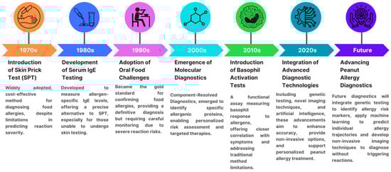 Allergy diagnostic methods can be categorized into traditional and emerging approaches. Allergen diagnostics have experienced significant advancements over the decades, starting with the introduction of skin prick testing in the 1970s, followed by the development of serum IgE testing in the 1980s, the adoption of oral food challenges in the 1990s, and the emergence of molecular diagnostics in the 2000s. In the 2010s, basophil activation tests were introduced, and more recently, the integration of advanced diagnostic technologies such as genetic testing and artificial intelligence in the 2020s has revolutionized the field, with further innovations expected in the future, see Figure 1.