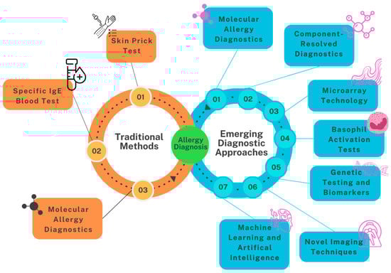 Traditional methods include the skin prick test, serum IgE blood testing with component-resolved diagnostics, and oral food challenges. Emerging diagnostic approaches encompass molecular allergy diagnostics, microarray technology, basophil and mast cell activation tests, genetic testing, machine learning and artificial intelligence, and novel imaging techniques, see Figure 2.