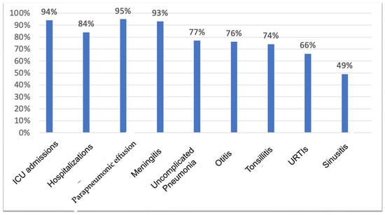 Recurrent infections were defined as four or more URTIs treated with antibiotics per year, four or more episodes of acute otitis media treated with antibiotics per year, and two or more episodes of sinusitis or pneumonia per year. Sepsis was characterized by bacterial generalized infection with organ dysfunction and inflammation. Otitis was defined as acute otitis media, and skin infections included cellulitis and impetigo. Episodes of pneumococcal invasive disease, such as pneumonia with parapneumonic effusion, meningitis, or sepsis, did not need to recur to be included in the study.