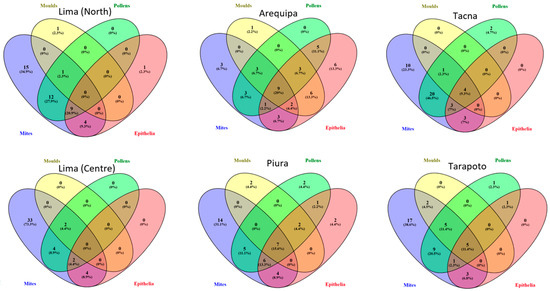 - Calderón-Llosa, O.M. Identification and sensitization to environmental fungal spores in Lima City, Peru. Rev. Alerg. Mex. (Tecamachalco Puebla Mex. 1993) 2024, 71, 82. [Google Scholar] [CrossRef] [PubMed]