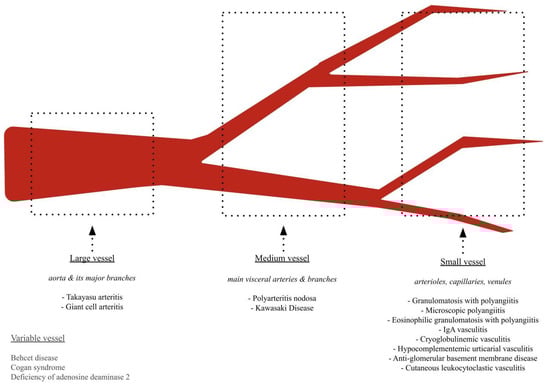 Medium vessel vasculitis (MVV) and variable vessel vasculitis (VVV) refer to a group of autoimmune disorders characterized by inflammation and damage to the blood vessel walls. Medium-sized vessels are defined as those measuring 800 μm or less in diameter, featuring four to eight layers of medial smooth muscle, and possessing an indistinct tunica adventitia. These vessels are primarily located in the subcutis or at the dermal–subcutaneous junction and include the main visceral vessels and their initial branches []. MVV includes polyarteritis nodosa (PAN) and Kawasaki disease (KD). VVVs involve arteries and veins of all sizes and include Behçet’s disease (BD), deficiency of ADA2 (DADA2), and Cogan syndrome (CS) (Figure 1).