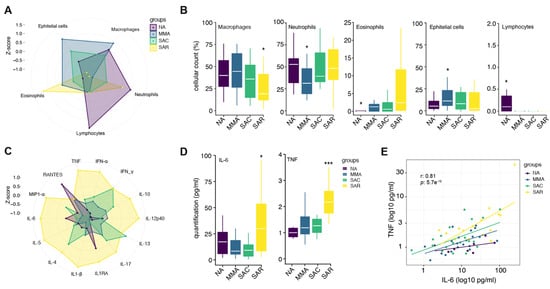 Phenotypic characterization of the studied population. Radar plot (A,B) box plots showing sputum cellularity data in asthma subgroups and non-asthma control group. (C,D) Cytokine production profiles of induced sputum in asthma groups. (E) Correlation analysis between IL-6 and TNF production in the three asthma subgroups and non-asthma control group; only strong Pearson correlations (|r| ≥ 0.8) observed in the SAR group are highlighted in the figure. The cell count and cytokine dosage of induced sputum were analyzed using the nonparametric and parametric tests (Mann–Whitney tests; Pearson’s correlation, respectively) performed between groups. *** p ≤ 0.001; * p ≤ 0.05. (see Table 1 and Tables S1–S3 for detailed analysis). Groups—SAR: treatment-resistant severe asthma; SAC: treatment-controlled severe asthma; MMA: mild-to-moderate asthma; NA: non-asthma control group.